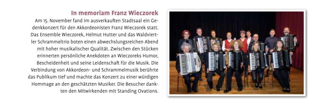 Am Samstag, 15. November fand im Stadtsaal in Waidhofen/Thaya ein besonderes Konzert zum Gedenken an den Akkordeonisten Franz Wieczorek statt, der über viele Jahre mit seinem Spiel und seiner Herzlichkeit das musikalische Leben der Region mitgeprägt hat.